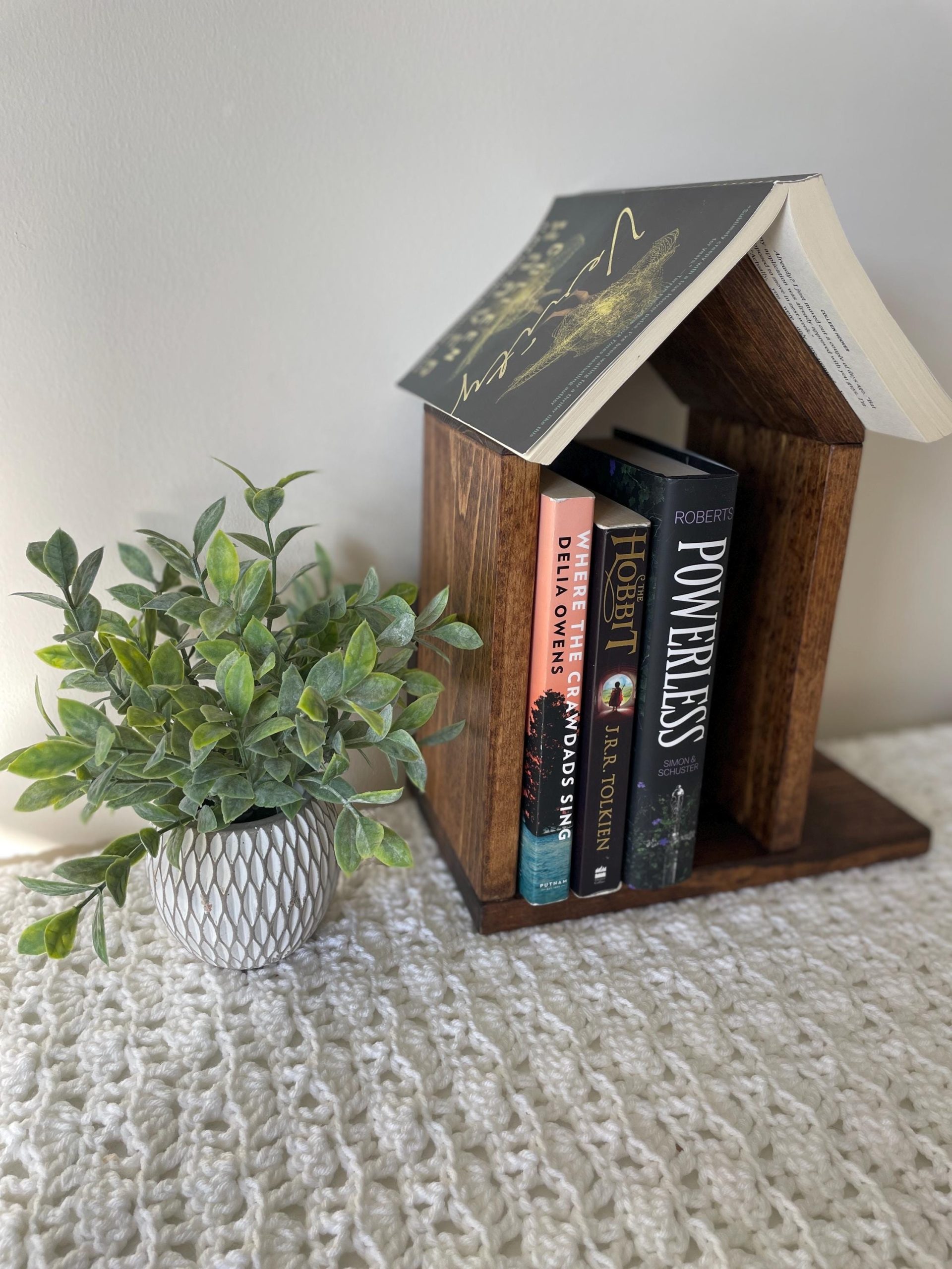 Book Lovers! This multi-purpose Book Nook fits perfectly on a nightstand or coffee stable. Great place to store your favorite books and hold your place!